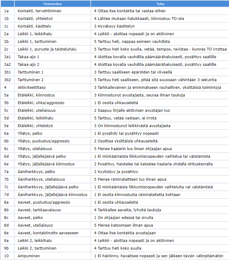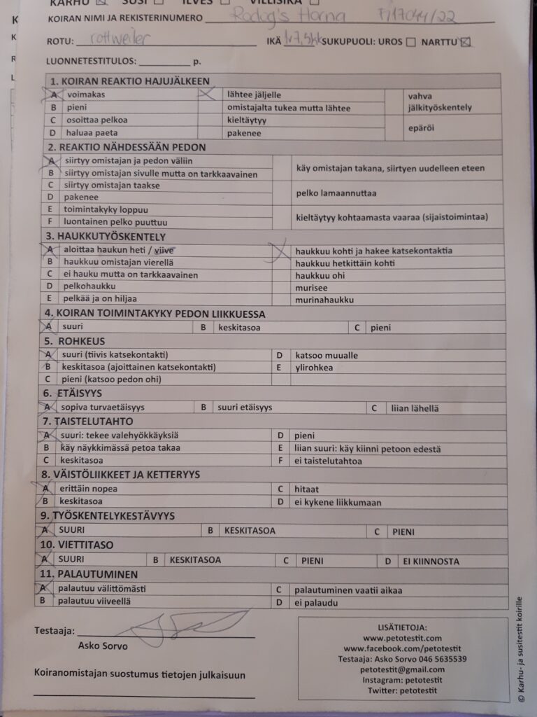 Silmät terveet, lonkat A/A, kyynärät 0/0